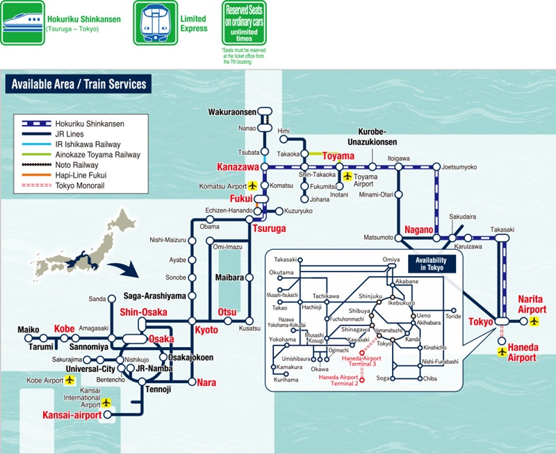 Ce pass vous permet d’utiliser tous les trains JR entre Tokyo et Osaka sur l’itinéraire Tokyo, Nagano, Toyama, Kanazawa, Kyoto, Osaka. Le Hokuriku Shinkansen jusqu’à Tsuruga est inclus.
